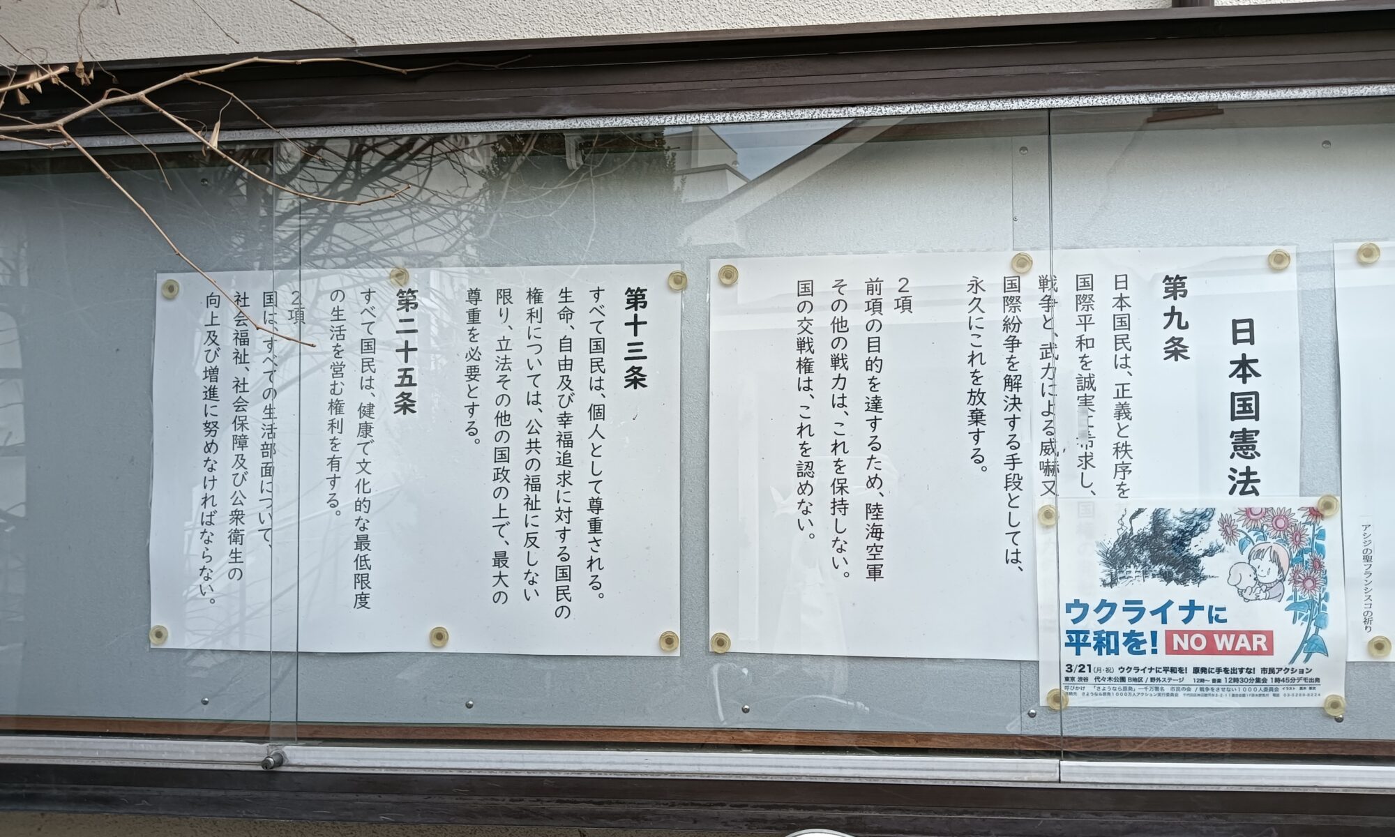 とある教会の掲示板にある憲法の条文。9条、13条、25条、何れも重要条文。