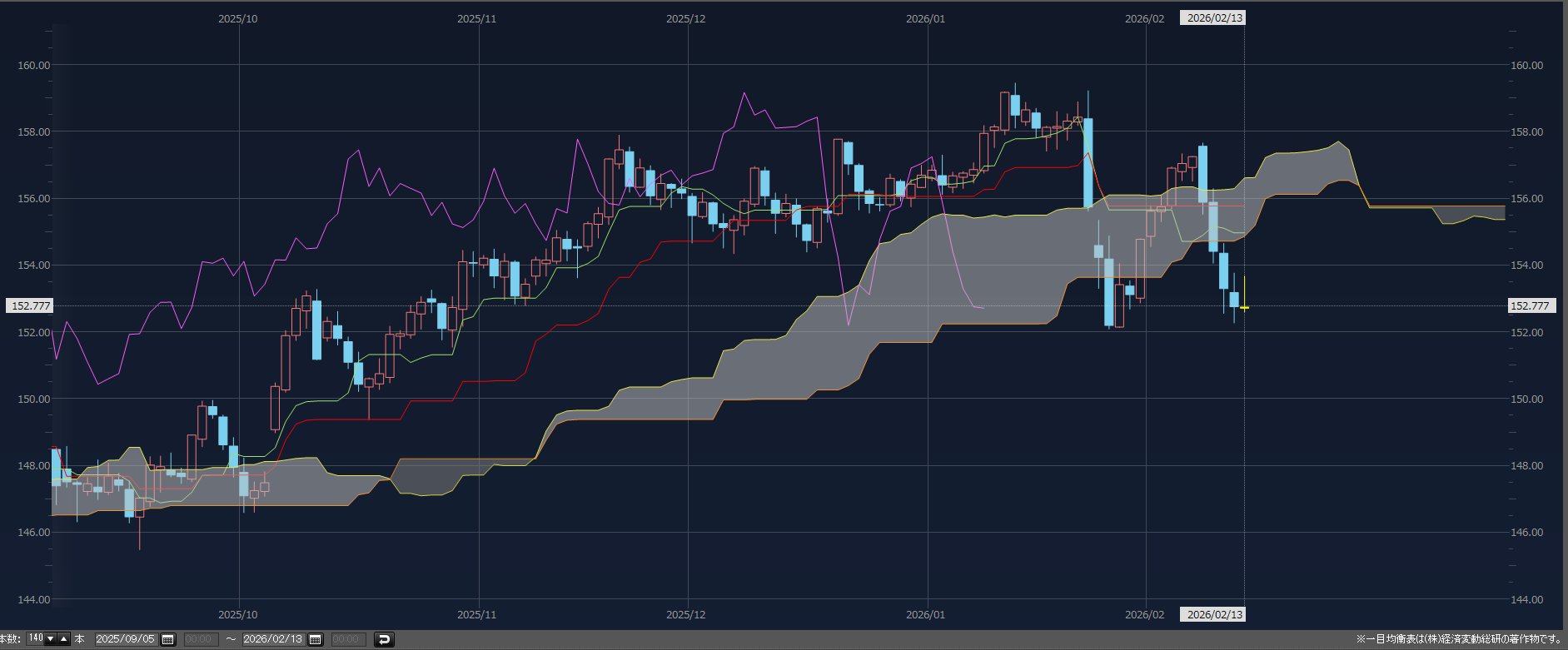 与党圧勝後、週明けから本格的動きがみられるか。ドル円(日足)の一目均衡表を眺めると、基準線と転換線がほぼ水平方向で推移している。両線、遅行線ともに雲の中にあることから、高市政権の本音、本質が現れることに伴い、大きく変動する予兆かもしれない。