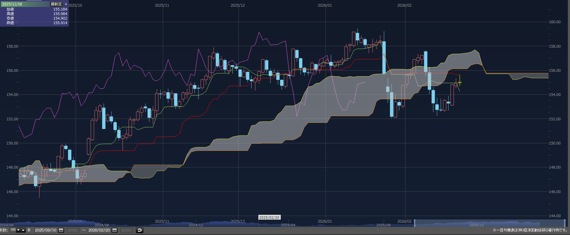 投稿日: 2026年2月15日2026年2月15日週明け動きありか 与党圧勝後、週明けから本格的動きがみられるか。ドル円(日足)の一目均衡表を眺めると、基準線と転換線がほぼ水平方向で推移している。両線、遅行線ともに雲の中にあることから、高市政権の本音、本質が現れることに伴い、大きく変動する予兆かもしれない。